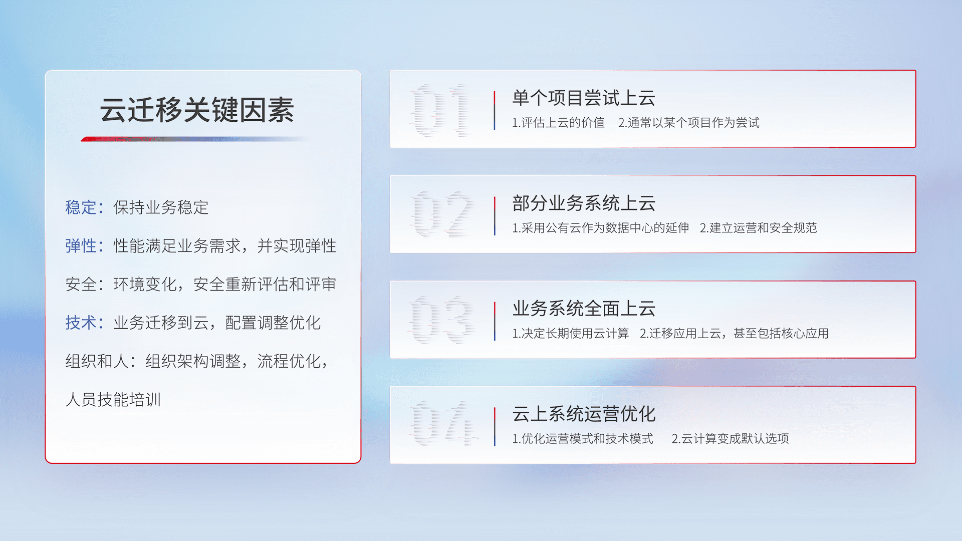 结合实际业务,,,,从规划设计、、、云平台选型、、、云原生改造、、、数据迁移、、、、集成交付,,迁移全过程为客户识别最佳上云路径,,做好风险识别管理,,,设计网络架构、、、、身份权限、、安全审计合规、、、操作审计、、、、日志审计、、、、监控告警策略、、多站点容灾设计等,,,对云上基础设施进行整体规划,,,提升IT治理水平,,,,以满足弹性、、、高可用、、高性能的需求。。