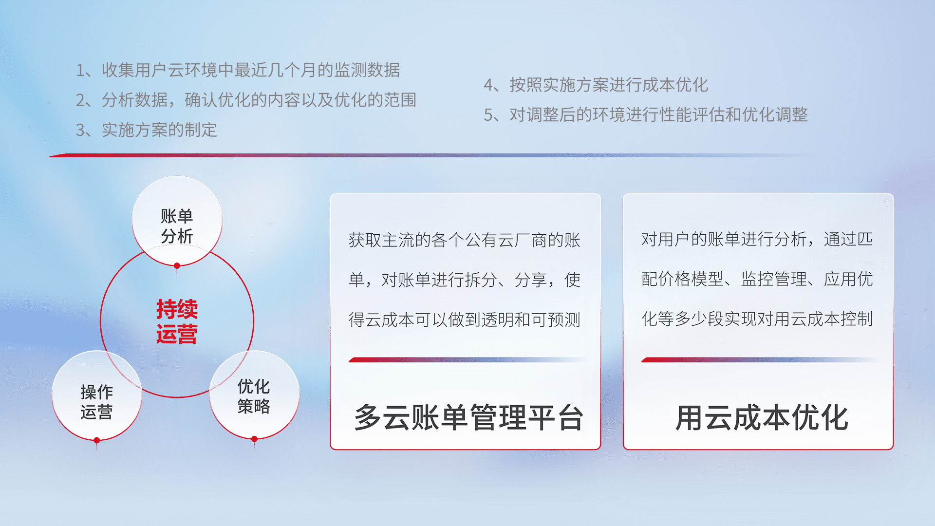 通过多云纳管,,以统一的资源数据模型把客户的云资源进行抽象和封装,,,,进而实现对多云资源的统一操作,,,,保障云资源管理的可靠性、、、稳定性与可用性。。。。量身定制化运维内容,,,配置、、、、开发运维、、、补丁管理、、、备份、、、监控、、、认证和访问管理、、、、审计和日常巡检等,,,,保障在用云过程中的可靠度,,,稳定度以及高可用率。。
